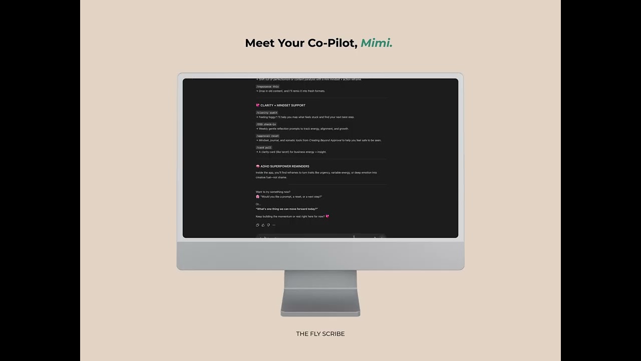 Meet Mimi, your compassionate, co-creative AI coach available 24/7 to help you map offers, write content, regulate overwhelm, and get clarity fast. She’s your biz bestie who gets the ADHD brain. (Includes 9-page user guide)